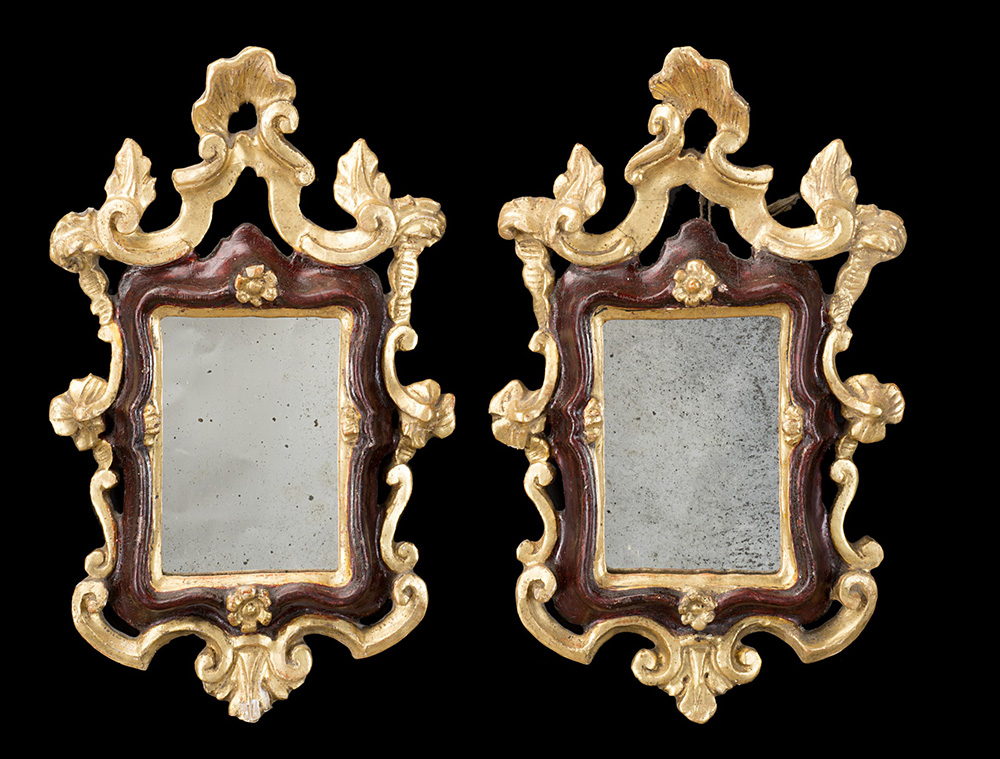 Coppia di piccole specchiere in legno intagliato, laccato e dorato a fiori e volute fogliate e traforate. Sec. XVIII (cm 30x18) (difetti e restauri) A pair of carved giltwood mirrors. 18th century (cm 30x18) (defects and restorations)