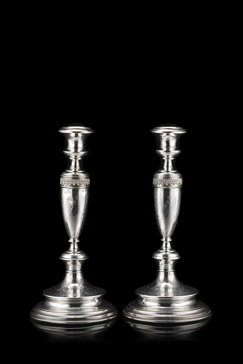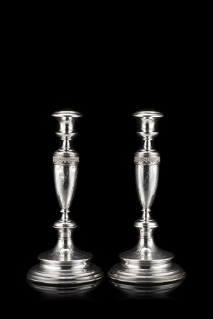 Coppia di candelieri in argento con piede circolare gradinato, fusto a...