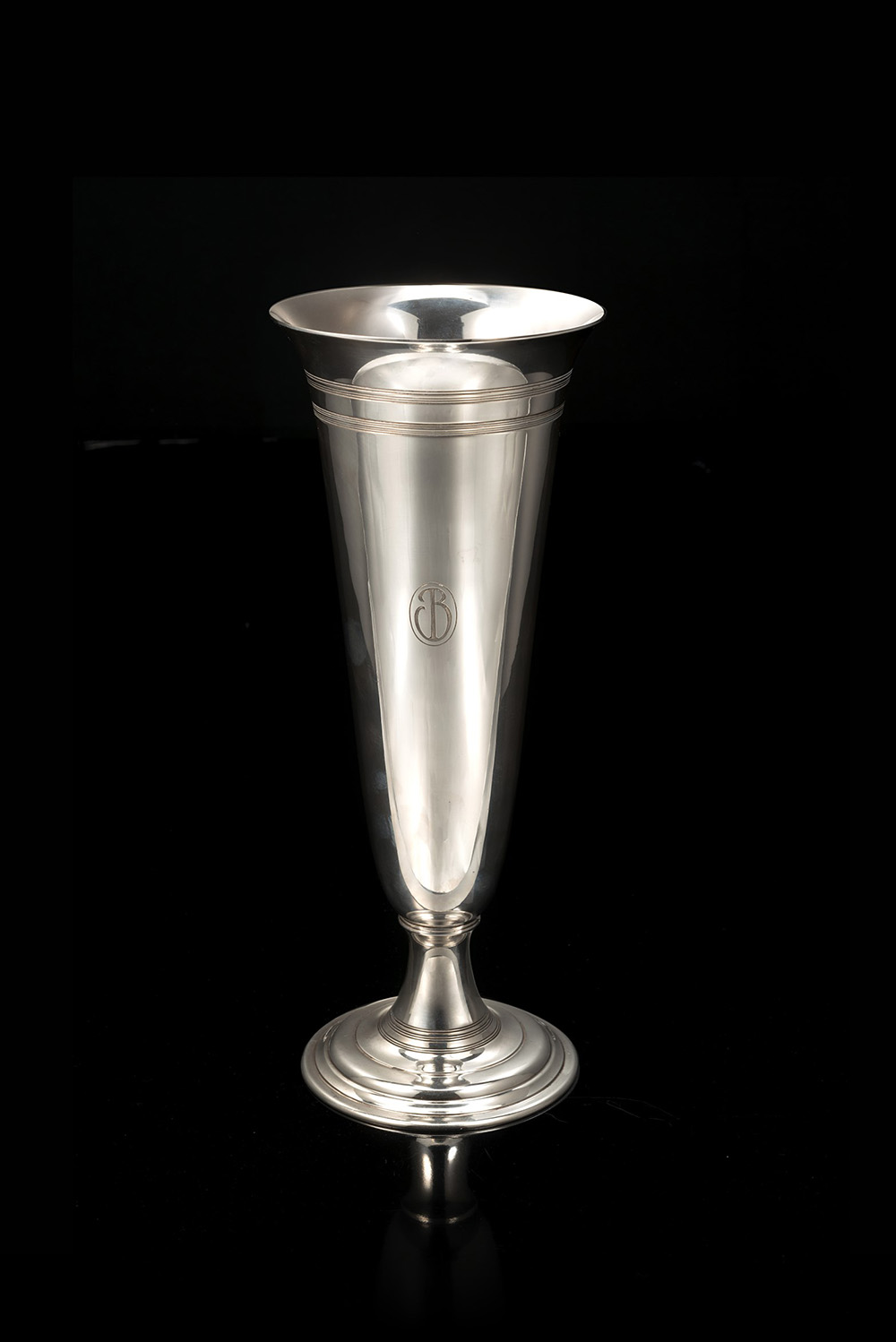 Vaso in argento di forma conica svasata e piede circolare rastremato; superficie liscia con cinture modanate e monogramma incisi. Stati Uniti, argentiere Tiffany & Co, 1907-1947 (h. cm 30,5 ca.) (gr 730 ca.) (lievi difetti) A silver vase. United States, silversmith Tiffany & Co, 1907-47 (h cm 30,5) (gr 730 ca) (minor defects)