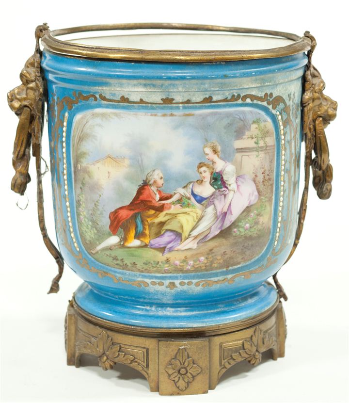 Vaso in porcellana di Sevres, seconda metà XIX secolo, a fondo azzurro con dipinta da un lato una scena galante e al retro dei fiori