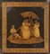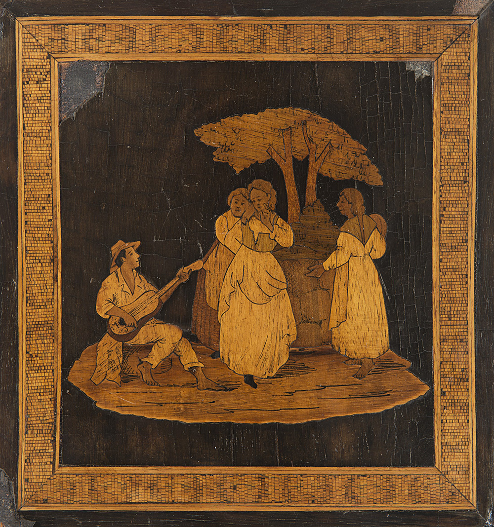 Arte sorrentina sec. XIX. Pannello intarsiato in legni vari a scena galante con suonatore di chitarra entro cornice filettata (cm 16x15) (difetti e mancanze) 19th-century Sorrento art. Various wood marquetry panel (cm 16x15) (defects and losses)