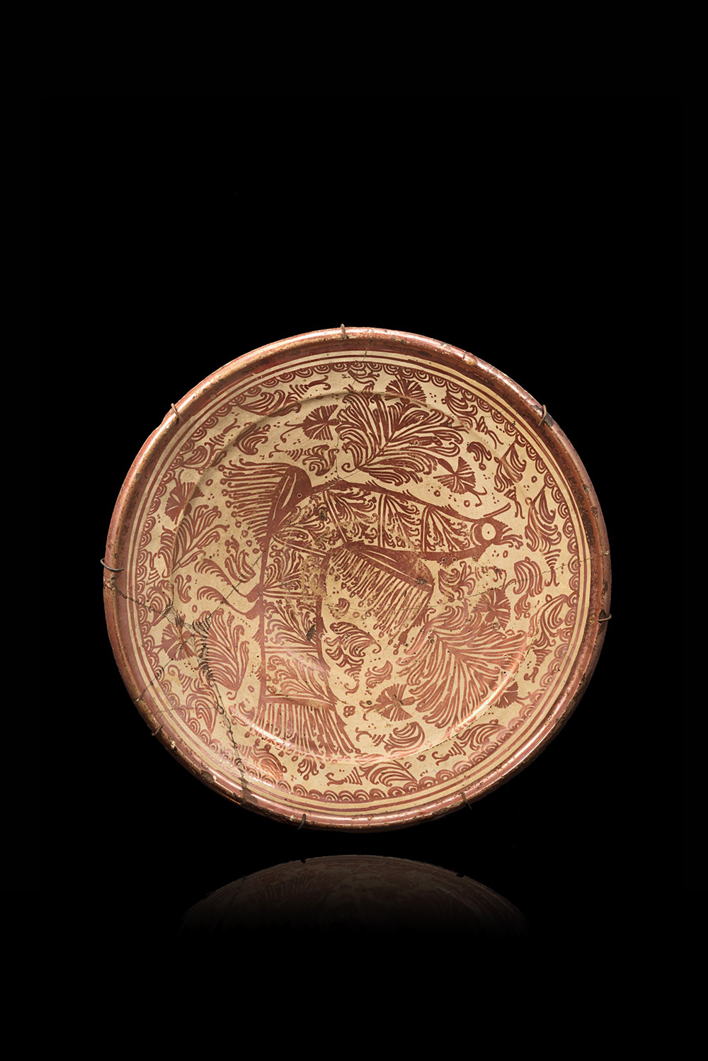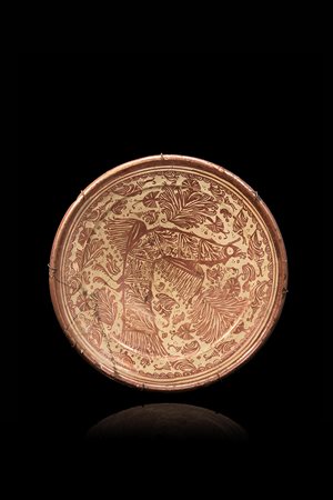 Arte ispano-moresca. Grande ciotola decorata a lustro a volatile nel cavetto...