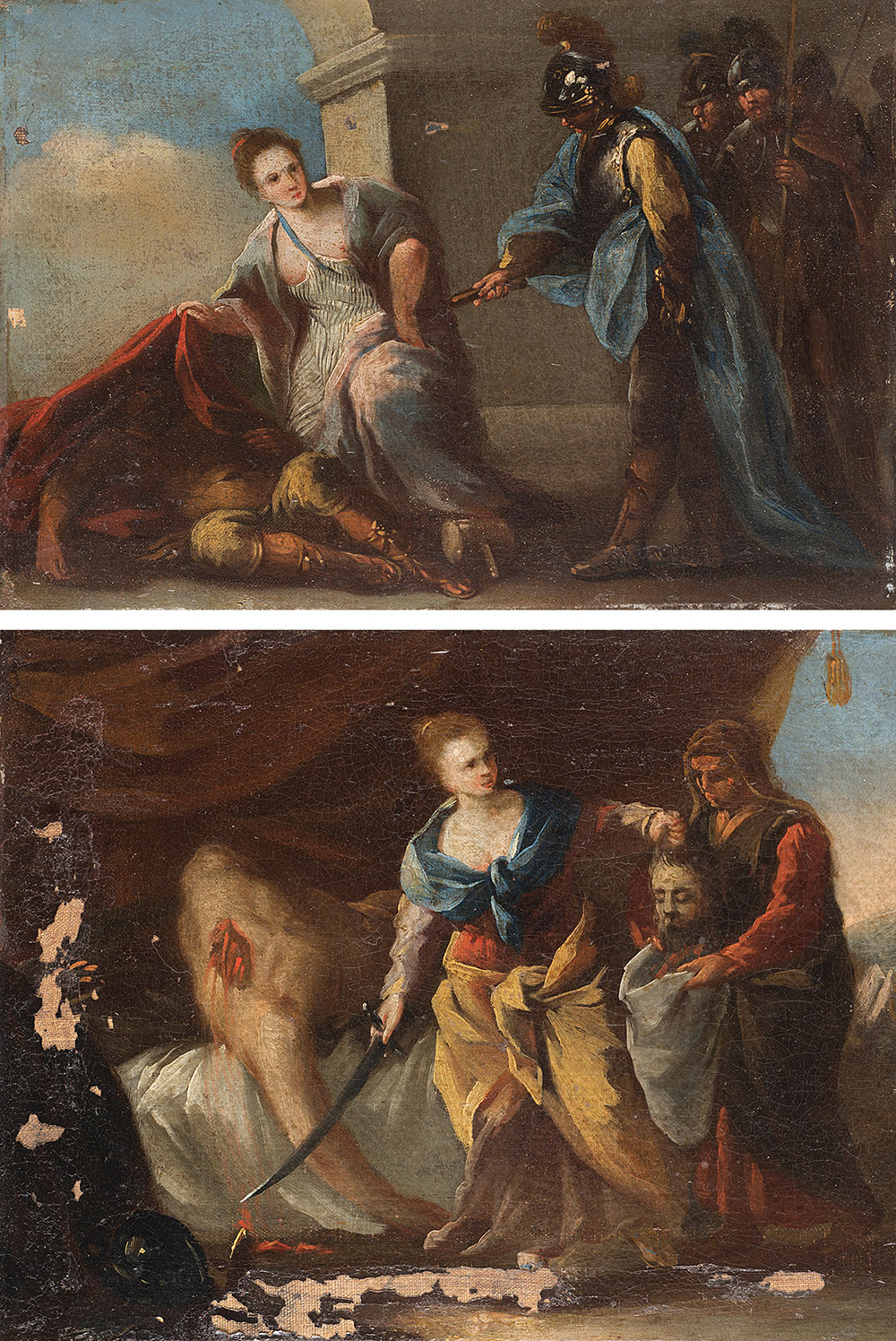 Scuola del sec. XVIII, coppia di dipinti ad olio su tela raffiguranti "Giuditta e Oloferne" e "Giaele e Sisara" (cm 17x24) In cornici coeve (difetti e restauri) 18th-century school, a pair of oil paintings on canvas "Judith and Holofernes" and "Giale e Sisara" (cm 17x24) Framed (defects and restorations)