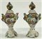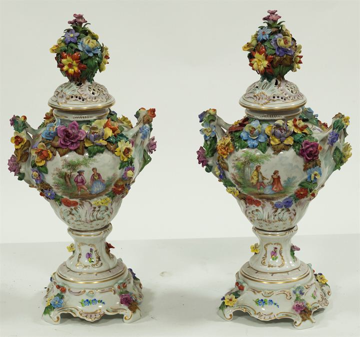 Coppia di vasi in porcellana con coperchio, Germania XX secolo, decorati con applicazioni di fiori e dipinti con scene galanti