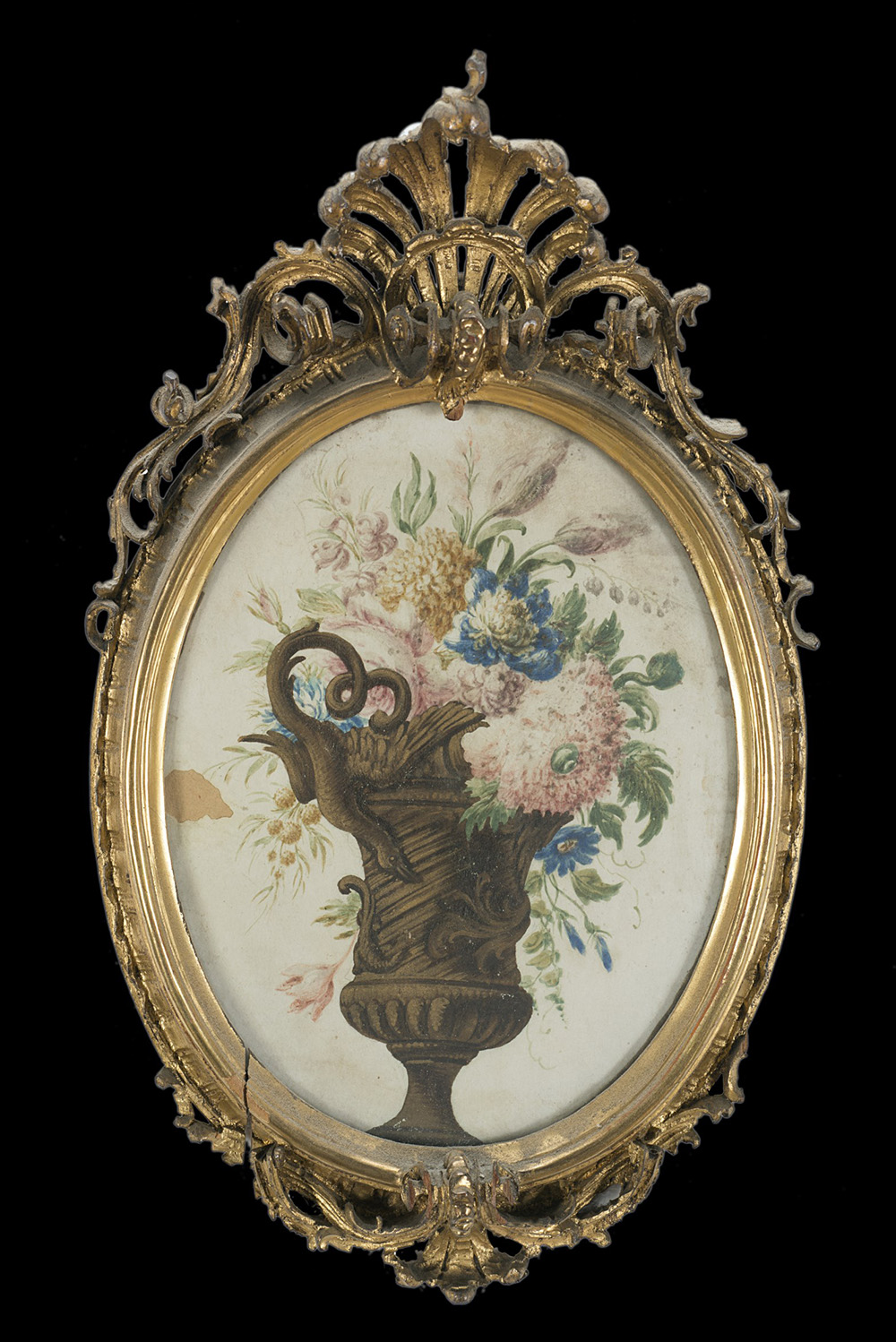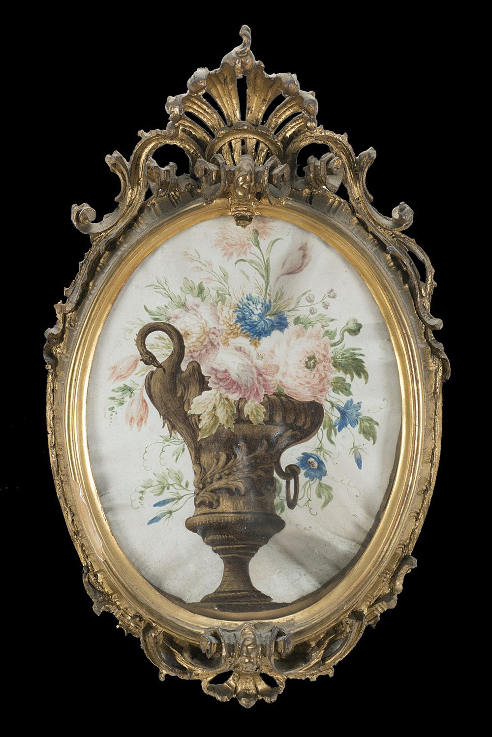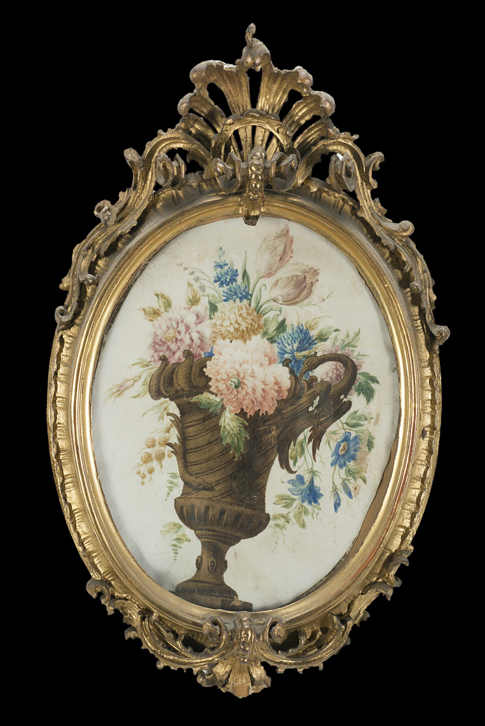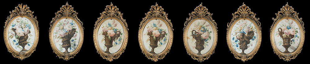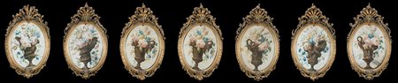 Scuola della fine del secolo XVIII "Vasi fioriti" gruppo di sei dipinti a tempera su pergamena ovale (cm 19x14) In cornici in legno intagliato, traforato e dorato (difetti) Late 18th-century school "Flowers in a vase" group of six tempera paintings on parchment. In carved giltwood frames (cm 19x14) (defects)