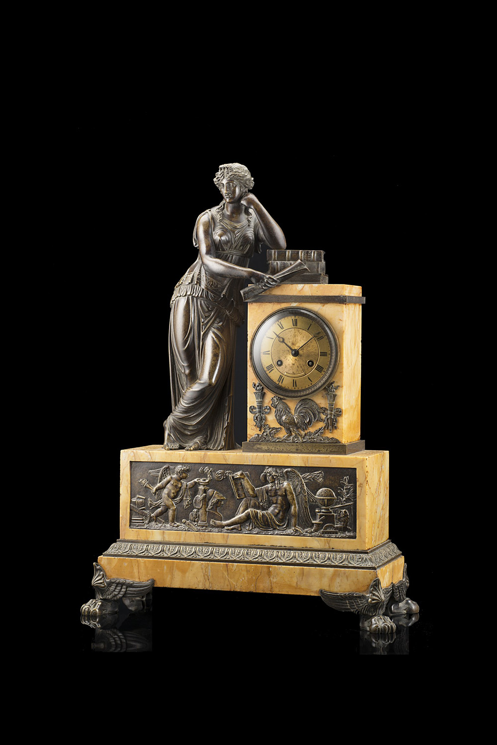 Pendola da tavolo in marmo sormontata da figura allegorica in bronzo brunito. Fronte decorato con fregi traforati a volute e scena classica. Quadrante in metallo a cifre romane. Movimento con carica settimanale con suoneria delle ore e delle mezza su campanello, scappamento ad ancora, sospensione a filo. Francia, sec. XIX (h. cm 57) A marble and bronze clock. France, 19th century (h. cm 57)