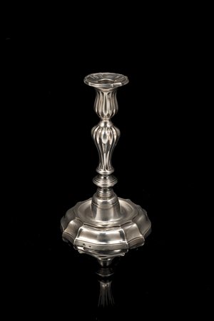 Candeliere in argento con piede circolare mistilineo gradinato, nodo lenticolare scanalato, fusto a balaustro e bobeche sagomati a baccellature e costolature radiali, piattino raccoglicera ad innesto. Genova, sec. XVIII, marchio della 'Torretta' 175 (?) e marchio sabaudo di Tolleranza, 1824-73, per vecchi lavori rientrati in commercio e Monte di Piet‡ (h. cm 21 ca.) (gr 550 ca.) (lievi difetti) A silver candlestick. Genoa, 18th century (h cm 21) (gr 550 ca) (minor defects)