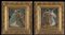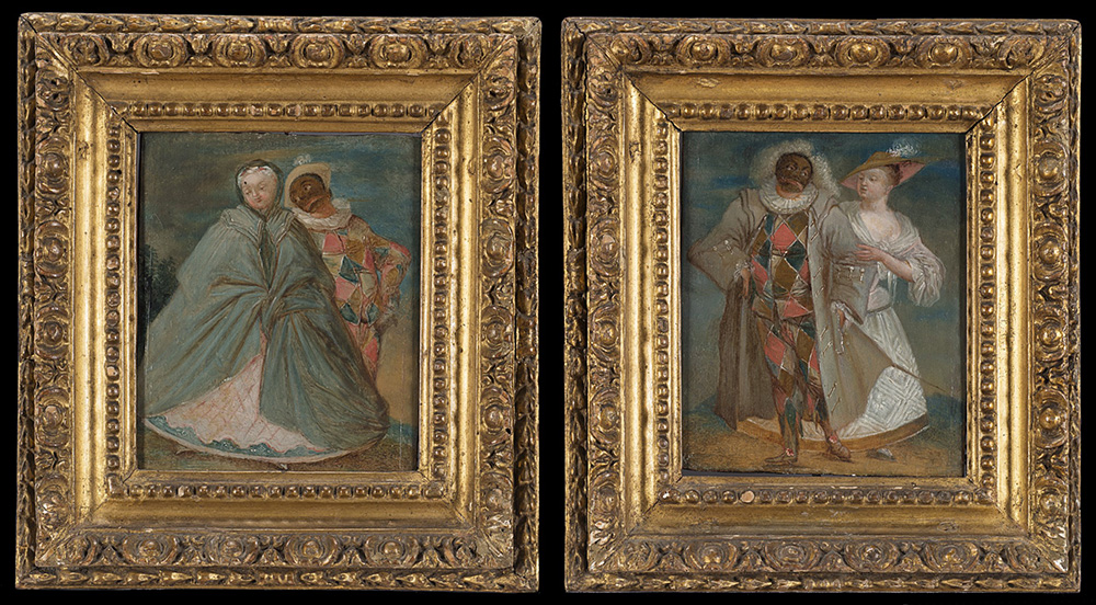Scuola francese dell'inizio del sec. XIX "Gentildonna con Arlecchino" coppia di miniature su tavola (cm 10,5x8,5) In cornici in legno intagliato e dorato (lievi difetti) Early 19th century French School, "Lady and Harlequin" a pair of miniatures on panel. Framed (minor defects)