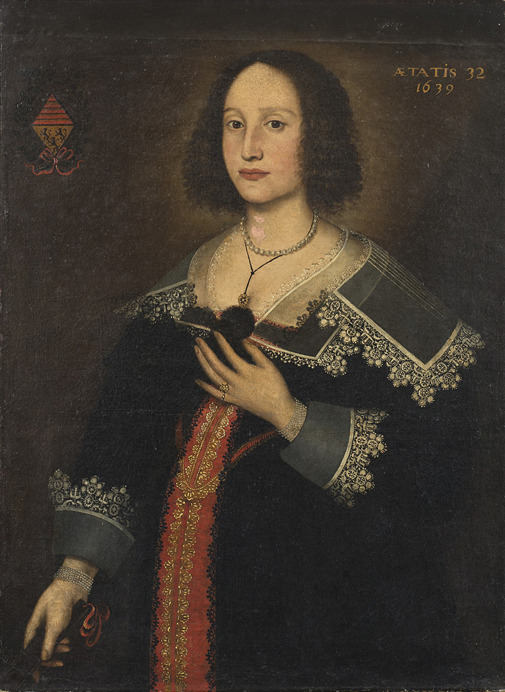 Scuola del sec. XVII "Ritratto di donna all'et‡ di 32 anni" olio su tela (cm 42x67) In cornice (difetti e restauri) 17th-century school "Portrait of a woman" oil on canvas (cm 42x67) Framed (defects and restorations)