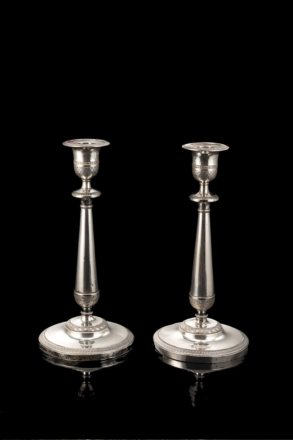 Coppia di candelieri in argento con piede circolare, fusto a balaustro e bobeche decorati a fasce godronate. Argentiere Corbella Cristoforo, 1822-61. Regno Lombardo-Veneto, Milano (h. cm 24) (gr 520 ca.) (difetti) A pair of silver candlesticks. Kingdom Lombardy-Venetia, Milan. Silversmith Corbella Cristoforo 1822-61 (h cm 24) (gr 520 ca) (defects)