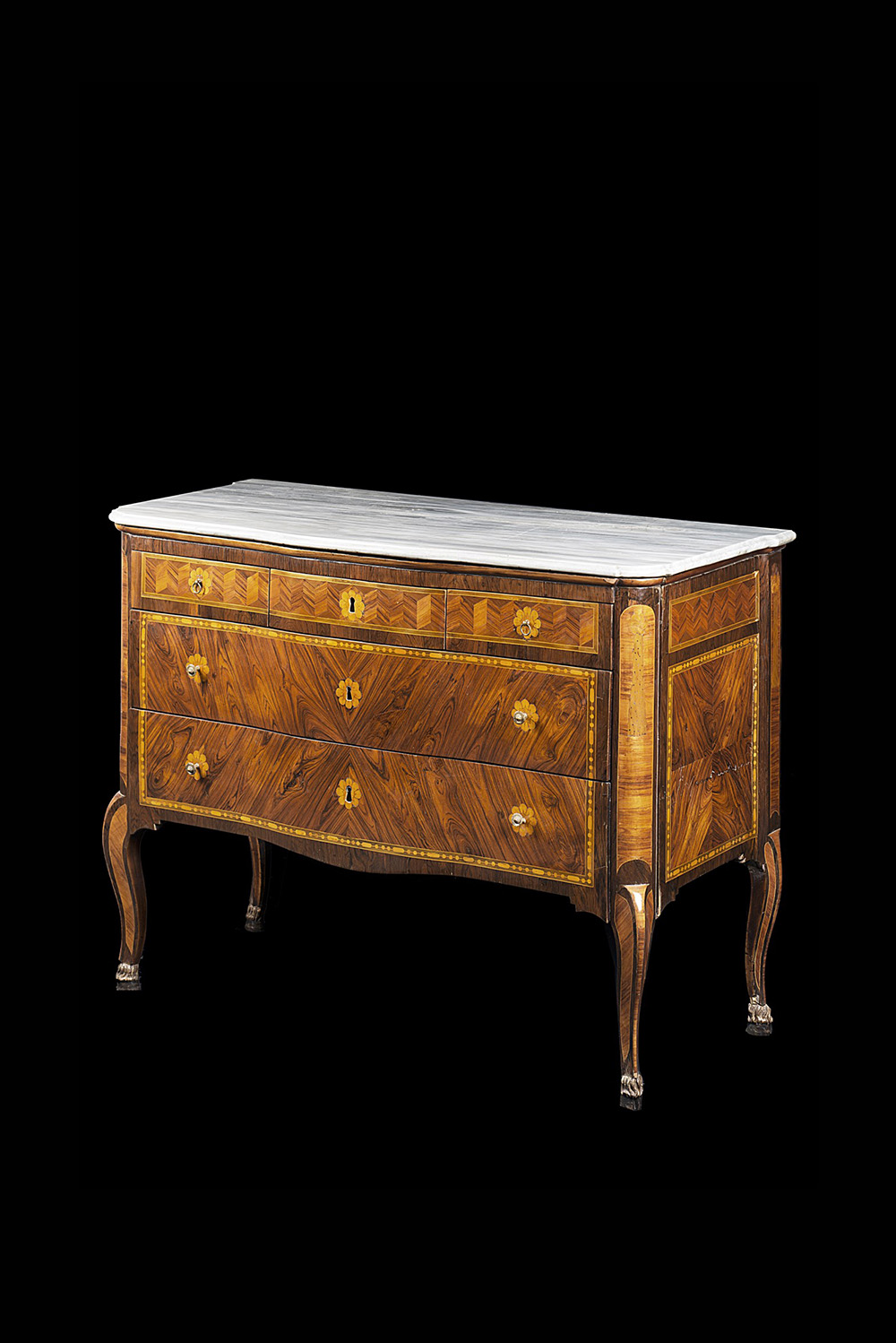 ComÚ lastronato in palissandro e filettato in legno chiaro, di forma mossa, tre tiretti nella fascia, due cassetti sul fronte, gambe mosse. Piano in marmo grigio. Piemonte sec. XVIII (cm 53x87x117) (difetti e restauri) A rosewood veneered commode with grey marble top. Piedomont, 18th century (cm 53x87x117) (defects and restorations)
