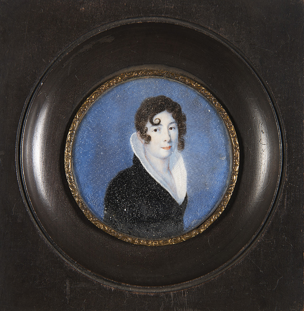 Maestro del sec. XIX "Ritratto di donna con colletto bianco" miniatura tonda (d. cm 6,5) In cornice in legno ebanizzato 19th-century master "Lady wearing a black dress and a white collar" round miniature (d. cm 6,5) Ebonised frame