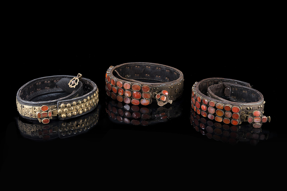 Gruppo di tre cinture del sec. XIX in cuoio: due turcomanne in cuoio incastonate in agata corniola e decorate da placche in bronzo traforate ed una probabilmente del Turkestan occidentale in cuoio con elementi traforati e fibbia con cabochon in agata corniola (difetti e mancanze) Group of three leather belts, 19th century: two Turkman belts with agate and bronze inserts and one probably from Turkestan with agata cabochon (defects and losses)