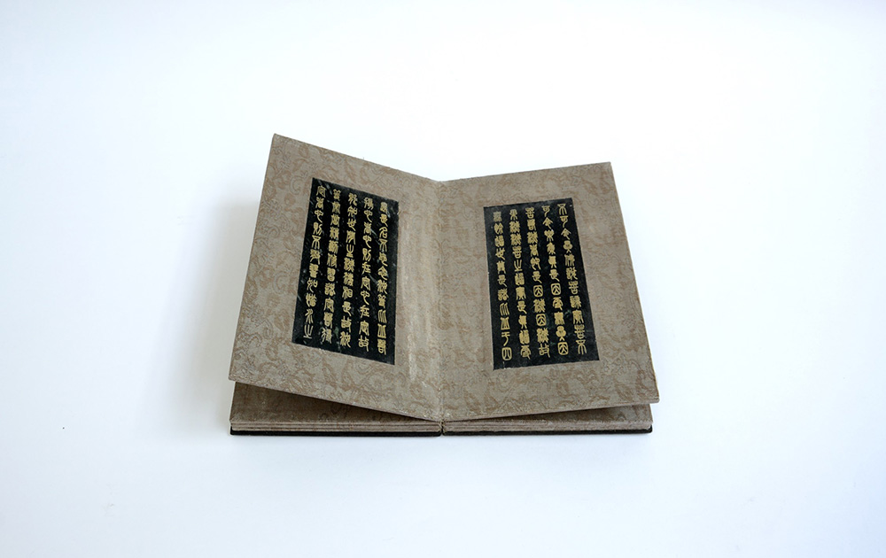 Piccolo volume contenente sutra con inserti nelle pagine in giada e scrittura sigillare Cina, sec. XX (h. 22,5 cm.)
