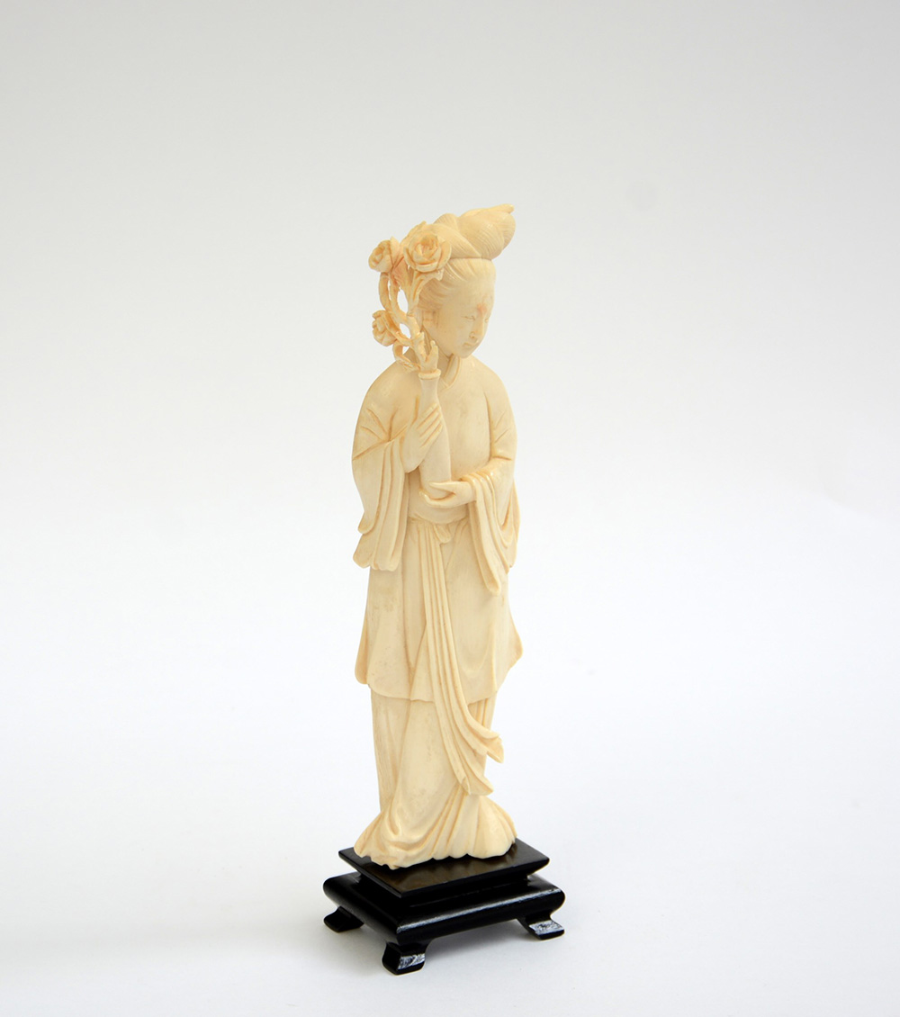 Piccola scultura in avorio raffigurante dama, con base in legno, Cina, sec. XX (h. cm 22) (mancanze)