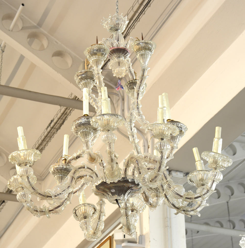 Manifattura di Murano Lampadario in vetro soffiato incolore a sedici luci con elementi montati a "schidione" lungo le braccia e i montanti superiori. Sec XX (d cm 110 ca, h cm 115) (difetti e mancanze)