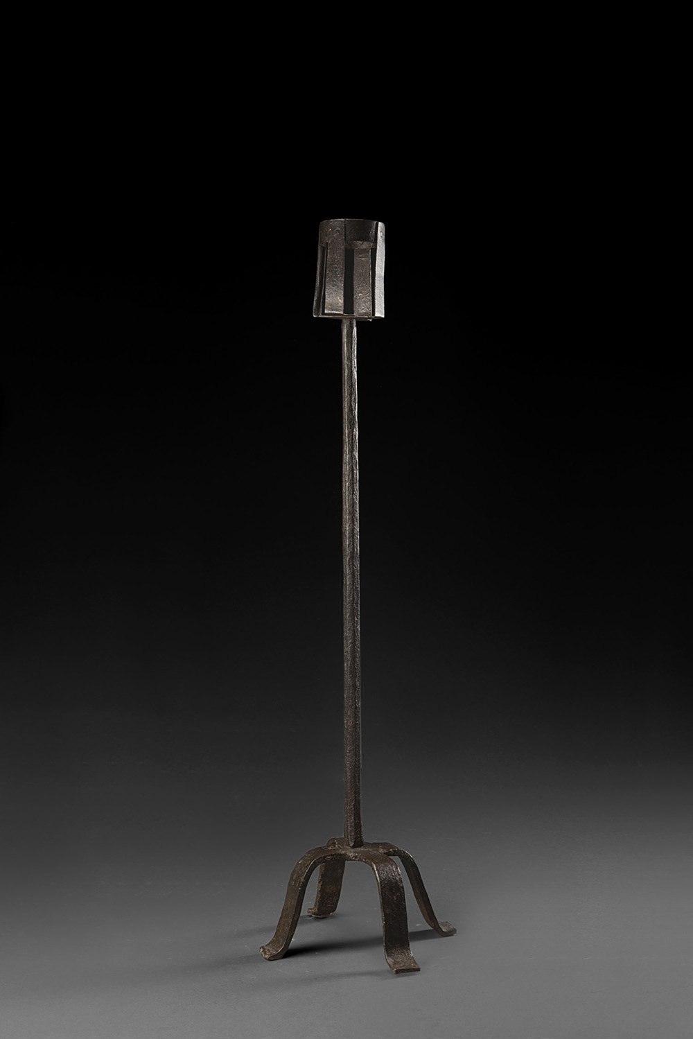 Porta cero in ferro battuto con colonna sfaccettata poggiante su quattro piedi sagomati. Sec. XVII (h. cm 127)