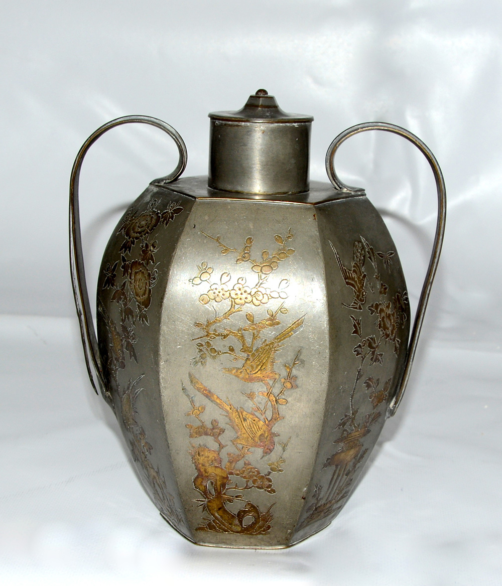 Vaso biansato Baitong a base esagonale con decorazione di volatili su rami in fiore, Cina, inizio sec. XX (h. cm 21)(difetti)