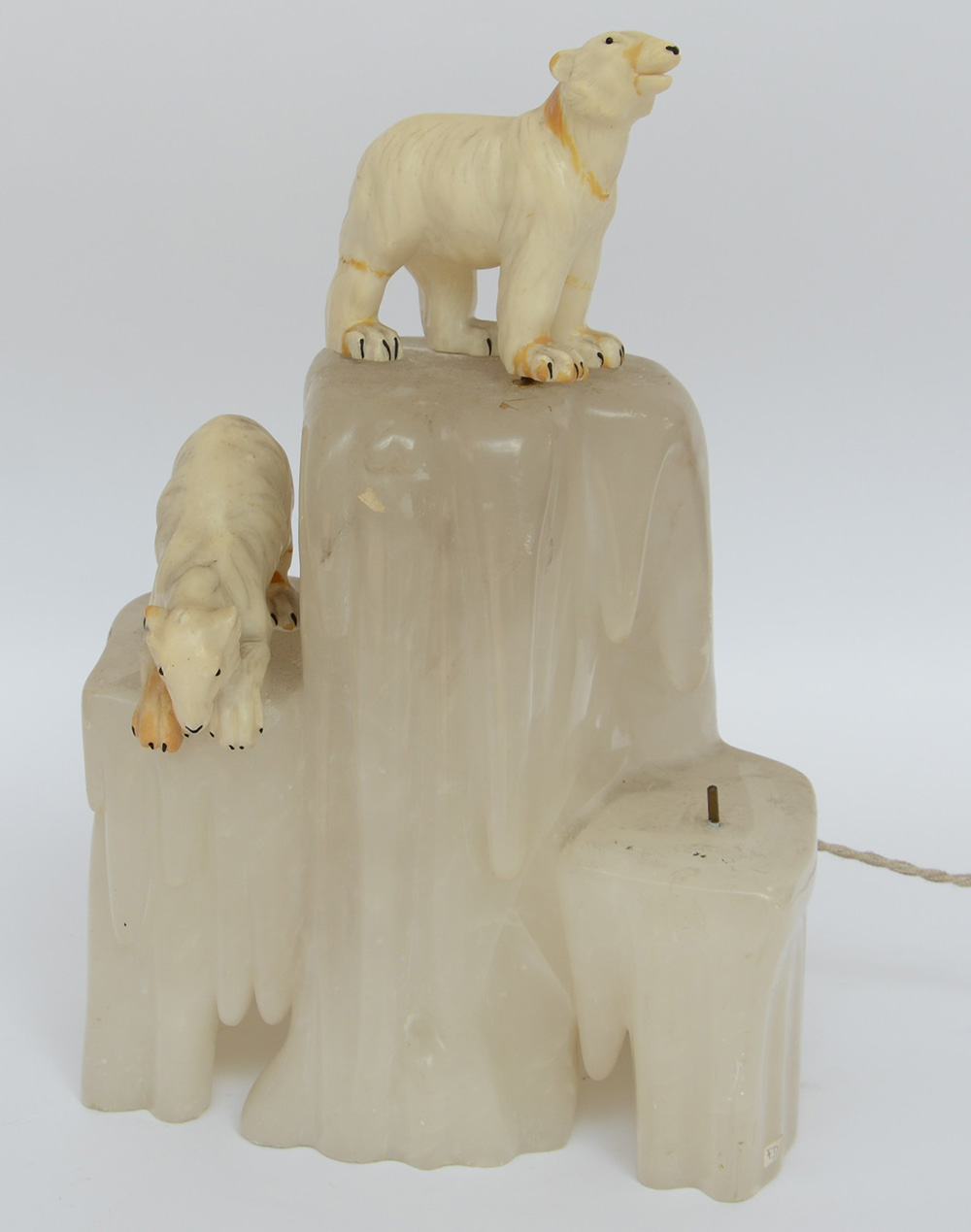 Lampada in alabastro decorata a guisa di iceberg con orsi polari. Seconda met‡ sec XX (cm h 41) (difetti e mancanze)