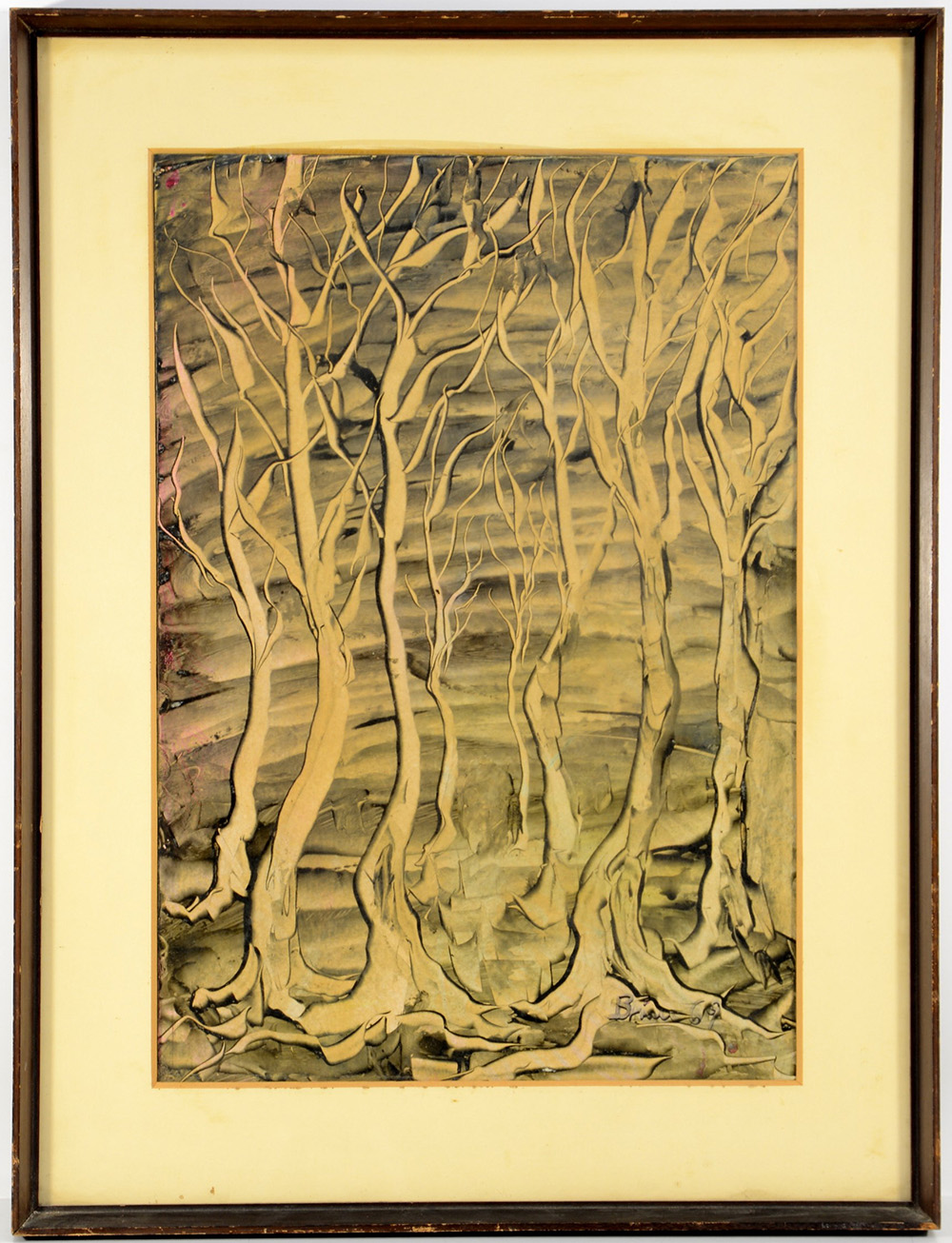 Firma indecifrata, "Composizione con alberi", tecnica mista su cartoncino (cm 49x34), firmato e datato in basso a destra, in cornice (difetti)