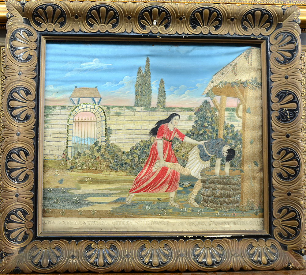 Lot 45 | Ricamo policromo raffigurante una matrona tebana (cm 43x51) in cornice in...