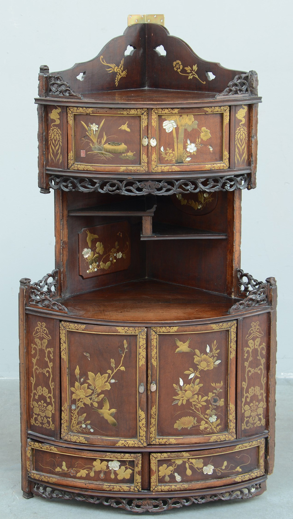 Mobile angoliera pensile in legno laccato e dorato con motivi floreali e...