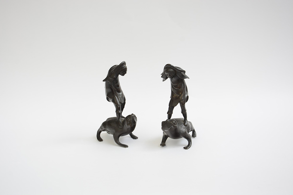 Coppia di candelabri in bronzo con personaggio mitologico su rospo Giappone, sec. XX (h. 21 cm.)