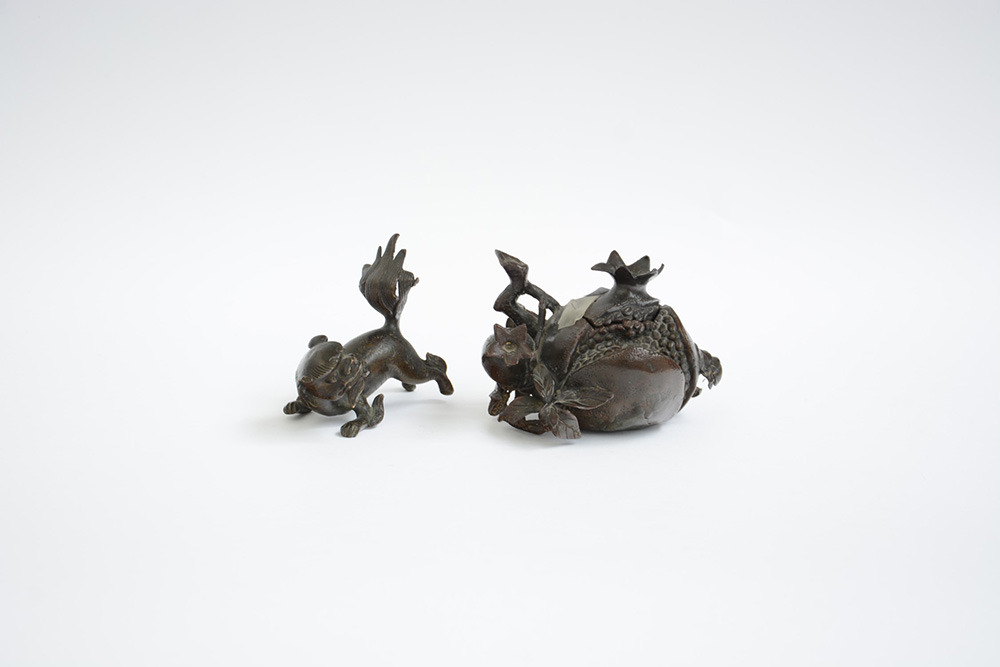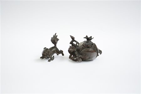 Contenitore in bronzo a forma di melograno con coperchio e piccolo leone buddhista (l. max 12 cm.)