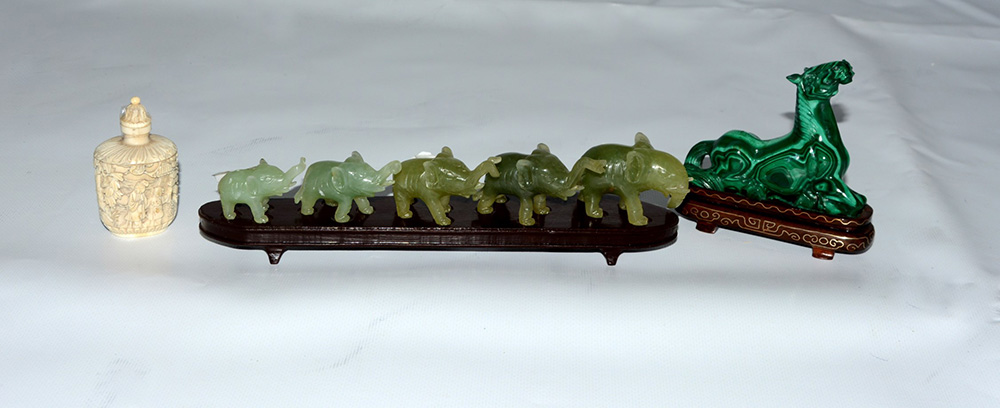 Gruppo di tre oggetti (cavallo in malachite, cinque elefantini in pietra dura e una snuff bottle in avorio) Cina, sec. XX (h. max. 8 cm.)