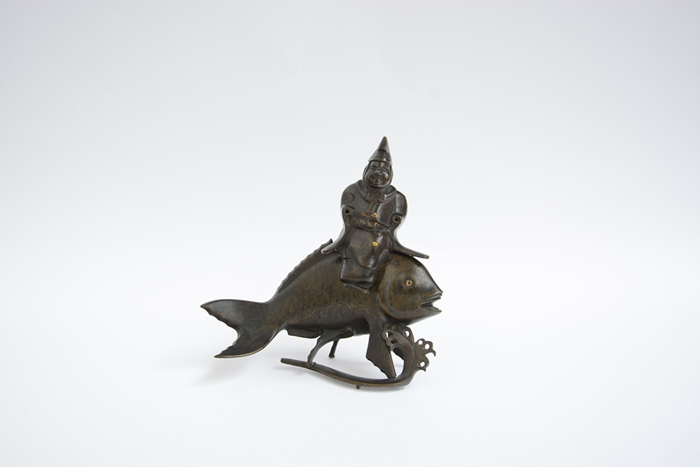 Gruppo in bronzo raffigurante pesce con pescatore (mancanze) Giappone, sec....