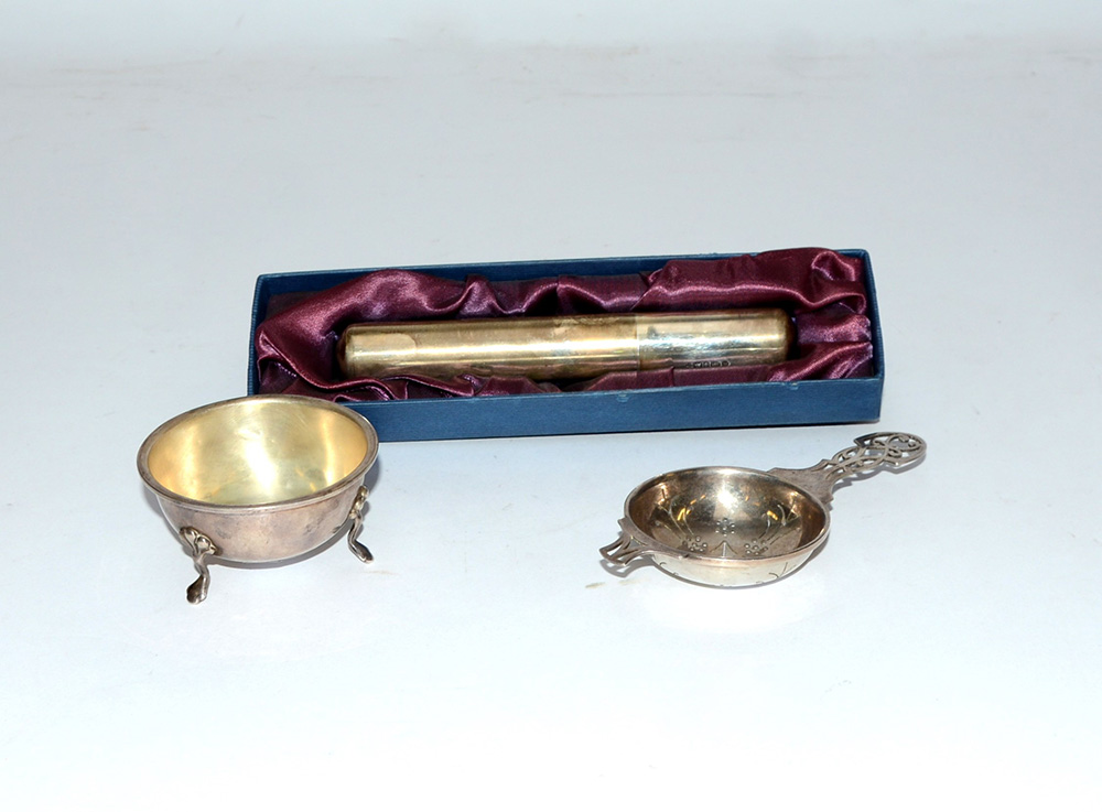Lotto in argento composto da un portasigari, un colino da tË ed una ciotola in argento. Inghilterra, sec. XX (gr tot 150 ca.) (lievi difetti)