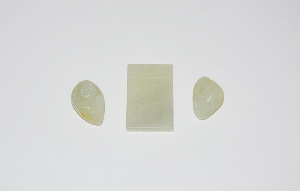 Tre piccole giade: una placca decorata con calligrafia cinese, una piccola scultura con un pesce, un piccolo "Buddha che ride" Cina, sec. XX (la placca h cm 5,8)