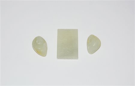 Tre piccole giade: una placca decorata con calligrafia cinese, una piccola...