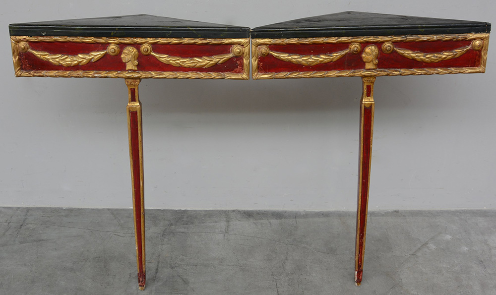 Coppia di antiche consolle ad angolo in legno laccato e dorato decorato con festoni e volti, gamba rastremata e scanalata (cm 63x82x38)