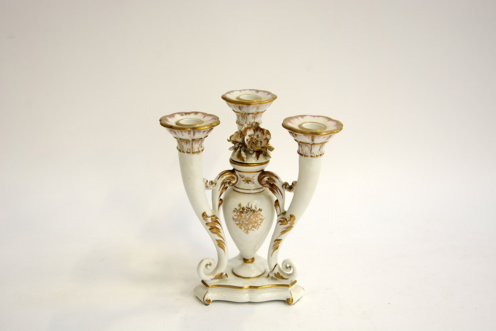 Cacciapuoti Manifattuta italiana.Candeliere a tre fiamme in porcellana di forma mossa decorato a dorature. Firmato sotto la base (h. cm 23) (difetti e restauri)