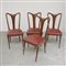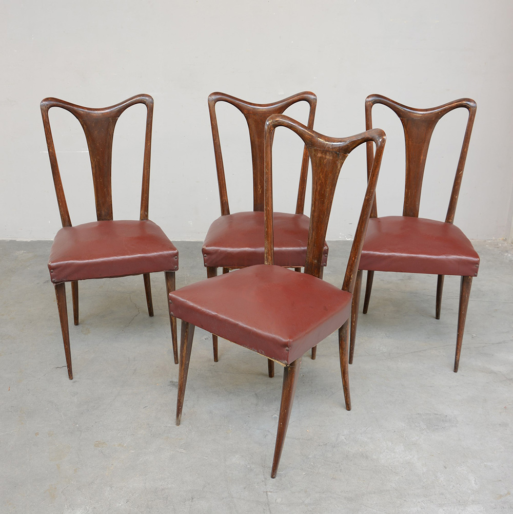 Gruppo di quattro sedie anni '40 in faggio con schienale sagomato a giorno. Gambe posteriori inflesse, anteriori tronco coniche, seduta in similpelle rosso scuro (difetti)