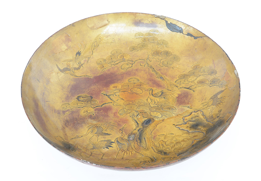 Grande ciotola in legno laccato decorata con gru in un paesaggio alla maniera orientale (difetti e mancanze)