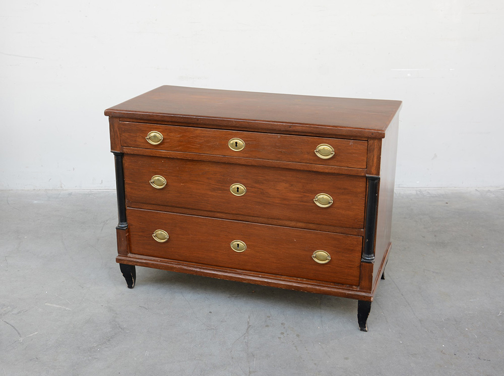 Comò a due cassetti grandi e uno piccolo sotto piano, decorato con mezze colonne ebanizzate come i piedi mossi (cm 104x76x51) (difetti)