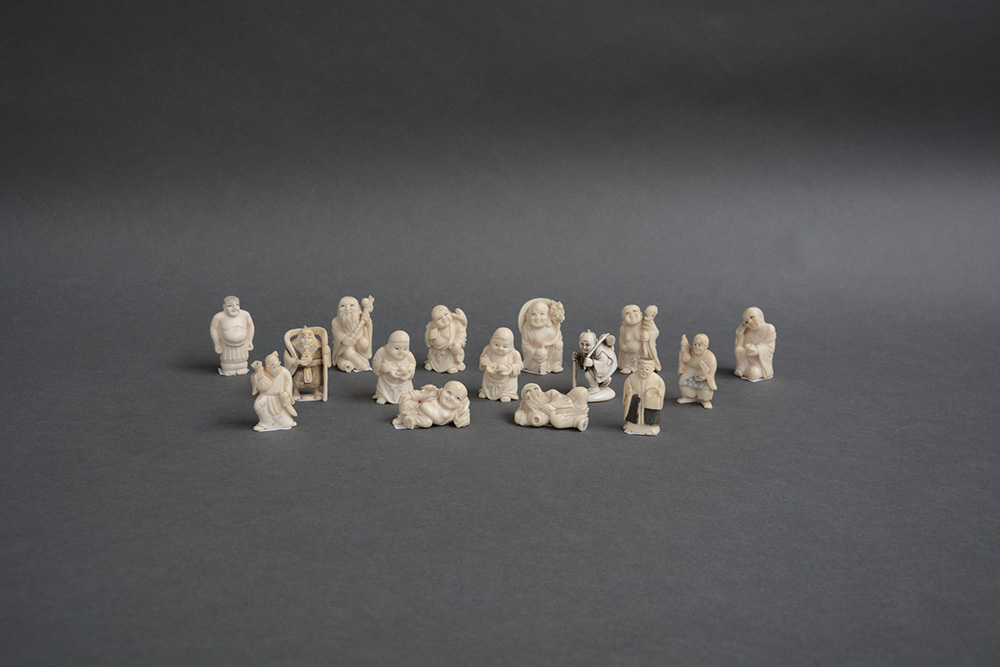 Gruppo di quindici netsuke in avorio, alcuni con firme