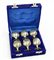 Lotto di sei piccole coppe in metallo argentato con decori incisi, in custodia (lievi difetti)