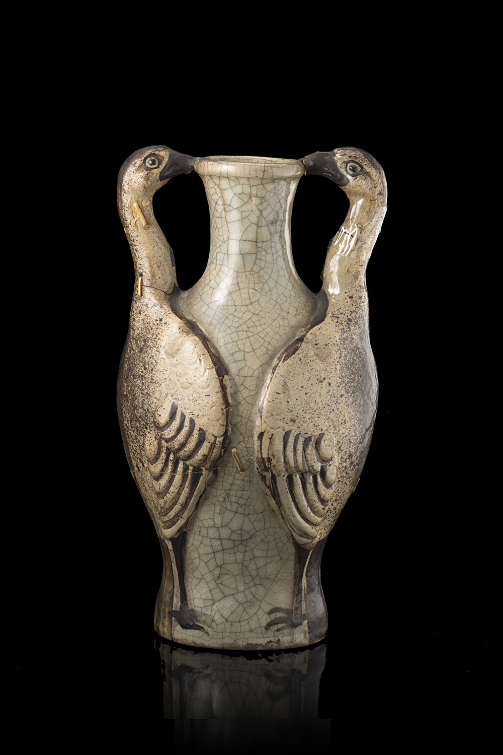 Vaso con invetriatura in stile ge con anse a guisa di aironi, marchio...