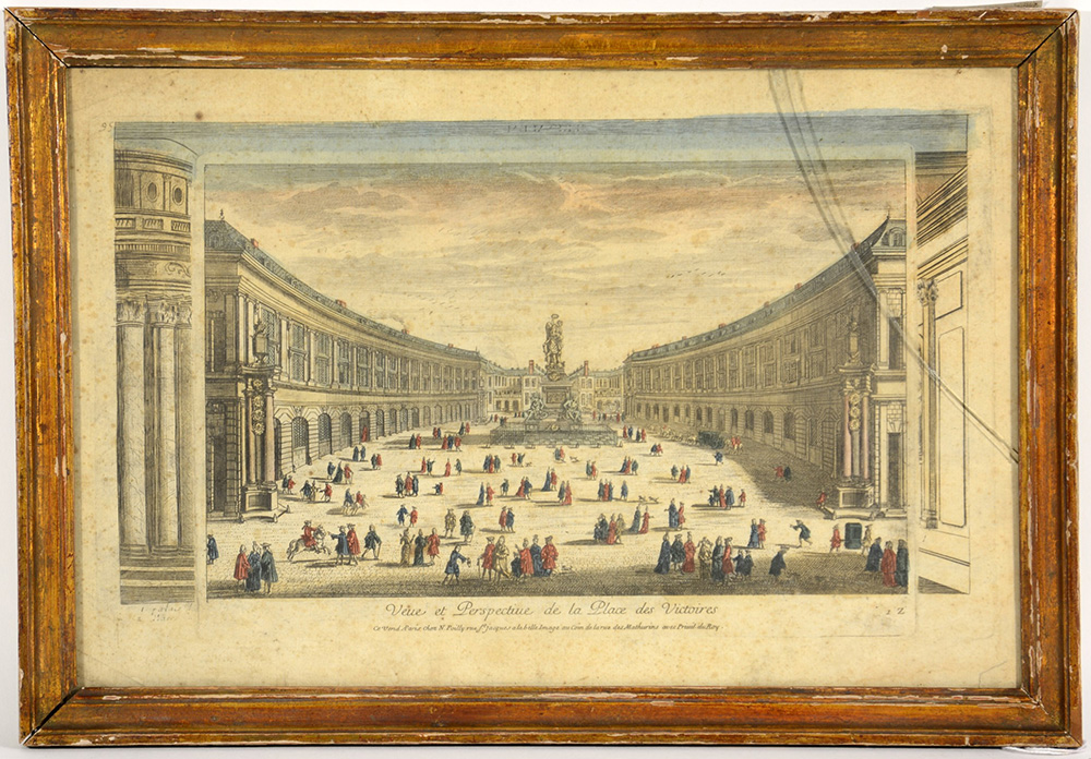 Stampa a colori raffigurante Place des Victoires. Francia, sec. XVIII. Coloritura di epoca posteriore (cm 28x42,5) (difetti)