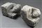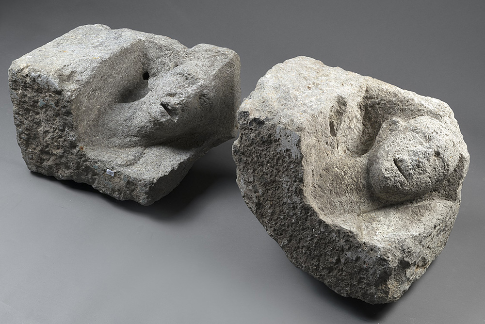 Due capitelli angolari raffiguranti visi in pietra scolpita (difetti)
