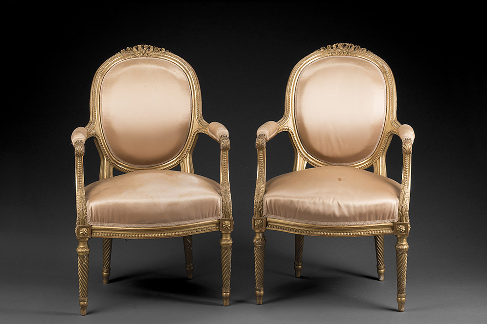 Coppia di poltrone in legno intagliato e dorato con schienale decorato a fiocco traforato. Braccioli scolpiti a volute, gambe a torciglione. Sec. XIX (lievi difetti)