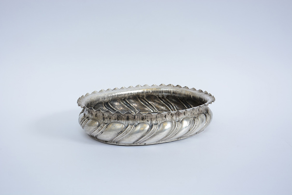 Centrotavola in argento di forma ovale con corpo a baccellature e costolature tortili (cm 33x24,5x7) (gr 850 ca) (lievi difetti)