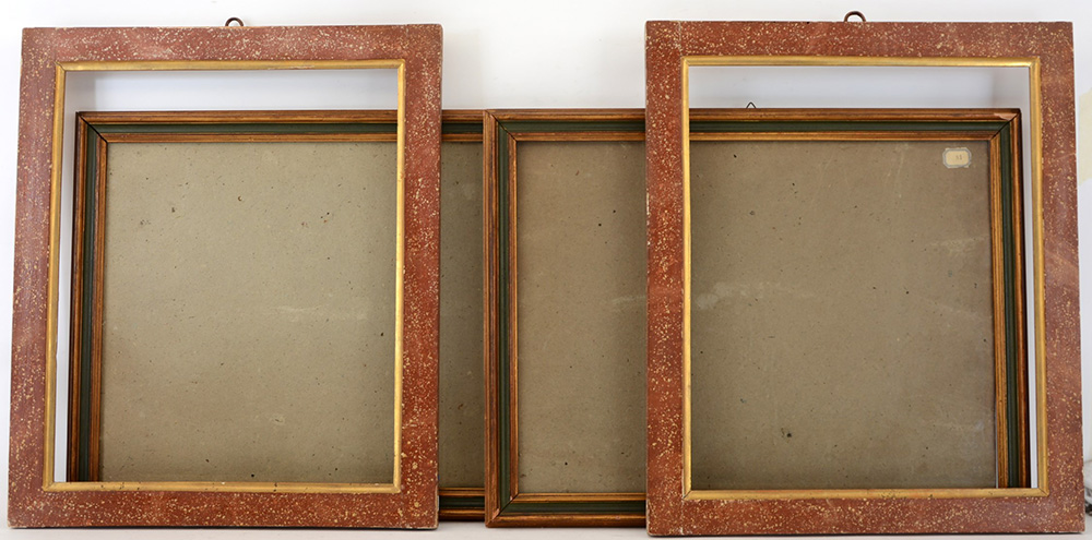 Lotto composto da una coppia di antiche cornici in legno dipinto a guisa di porfido rosso e una coppia in legno dorato con filettatura verde (luci cm 40x49 e 55,5x41,5) (difetti)