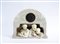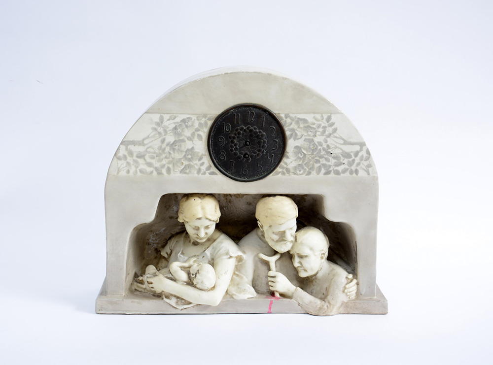 Orologio da camino in ceramica decorato con figure, quadrante in metallo a numeri arabi (difetti)