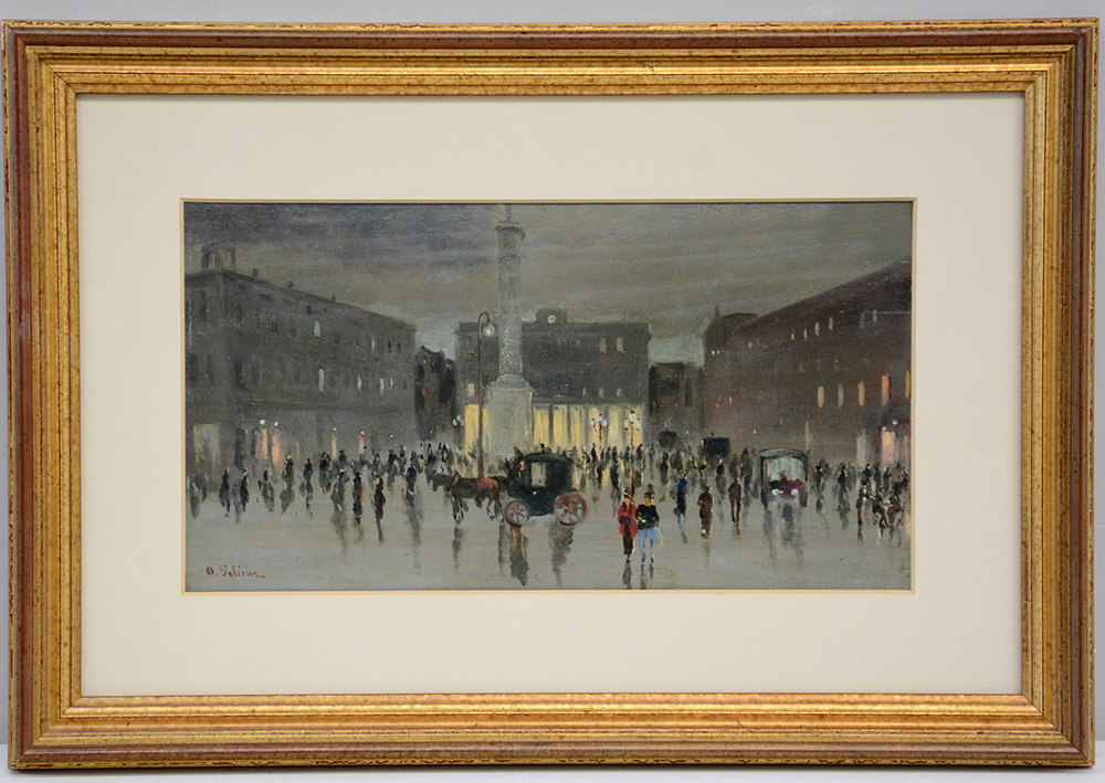 Pellissier "Scorcio di Parigi con figure e carrozze". Olio su cartone (cm 18x33). Firmato in basso a sinistra. In cornice