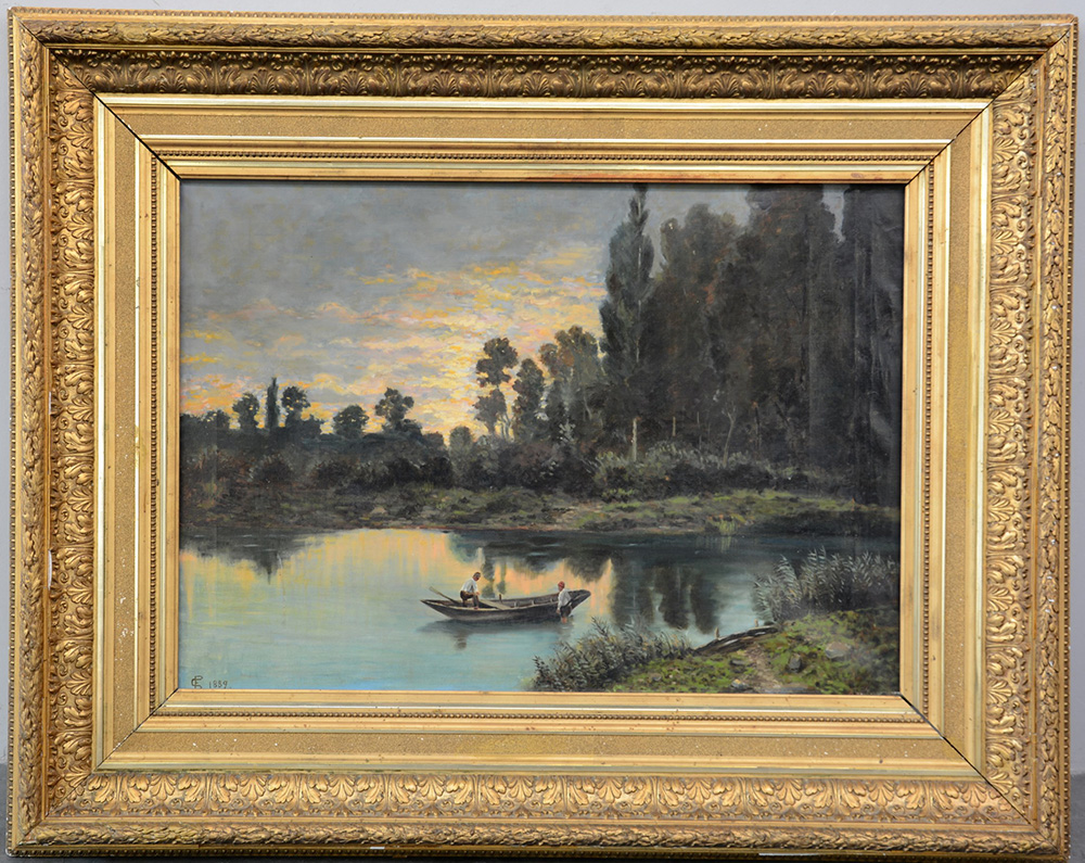 Scuola del sec. XIX, "Paesaggio fluviale con barca e pescatori", olio su tela (cm 60x85). Siglato e datato 1889 in basso a sinistra. In cornice