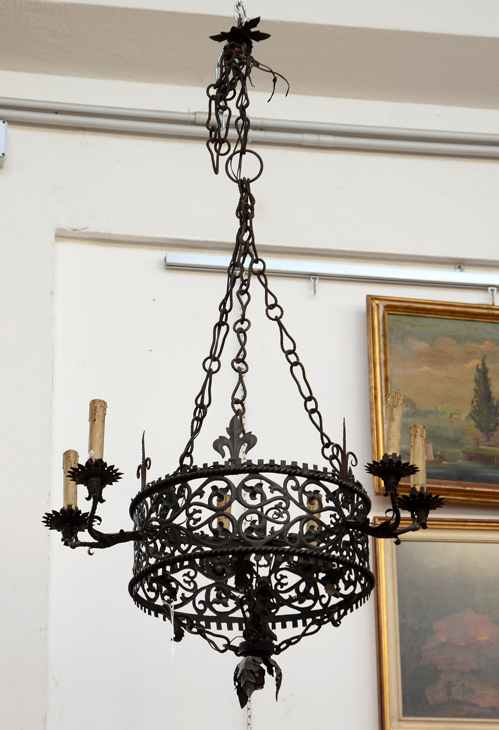 Lampadario a sei luci in ferro battuto con fascia traforata decorato a motivi...